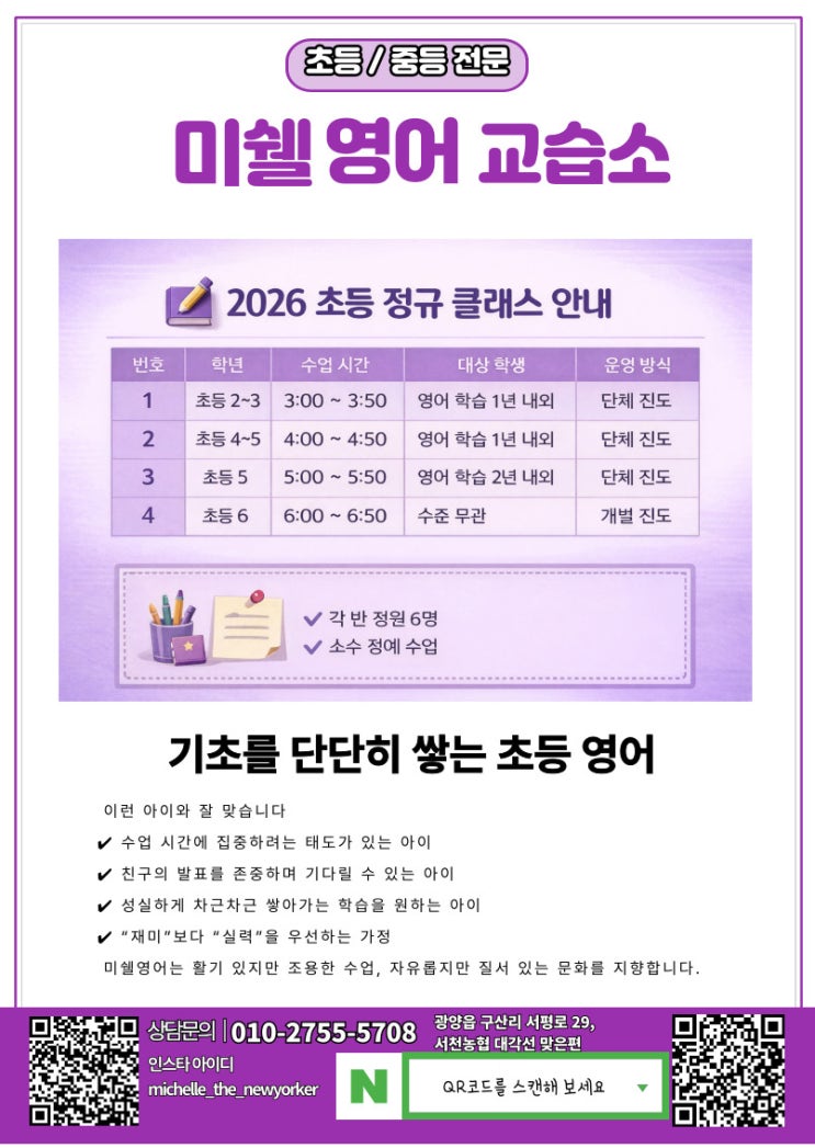 2026 초등 정규 클래스 안내 방학이 마무리되어 가는 시점입니다. 새 학년을 준비하며, 영어 학습의 방향을 고민하시는 가정도 많으실 것 같습니다. 미쉘영어 2026 초등 정규 클래스 안내드립니다. 미쉘영어는 어떤 공간인가요? 미쉘영어는 단순히 영어 지식을 전달하는 공간이 아니라 ‘학습 태도’까지 함께 만들어 가는 교습소입니다. 수업은 밝고 활기 있게 진행됩니다. 아이들은 발표도 하고, 웃기도 하고, 질문도 많이 합니다. 하지만 동시에, ✔ 수업 시간에는 정해진 흐름을 지킵니다. ✔ 친구의 학습을 방해하는 행동은 바로 교정합니다. ✔ 서로의 차례를 존중합니다. ✔ 끝까지 마무리하는 힘을 기릅니다. 활발한 아이도 괜찮습....... <img src="https://blogthumb.pstatic.net/MjAyNjAyMTFfMjEy/MDAxNzcwODE1NDM1Njcx.TJZGZ9zlHNPOJMdWGtlppJdT5JTRZZjTCm5bzxvNOSYg.Tjy2p_9AA_Vm17kZIXbjNRDBPmpHdQ-ZuwBES6Cciz0g.JPEG/%B1%E2%BA%BB%C6%B2_%BA%B9%BB%E7%BA%BB-001_%284%29.jpg?type=s3" />