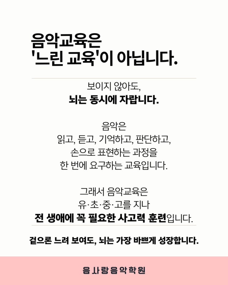 아이 교육을 이야기할 때 우리는 종종 '눈에 보이는 결과'를 먼저 떠올립니다. 문제를 빨리 푸는 아이, 정답을 정확히 맞히는 아이. 물론 기술은 중요합니다. 하지만 기술은 상황이 바뀌면 쉽게 한계를 드러냅니다. 눈앞의 문제 하나를 푸는 능력은 분명 기술입니다. 반면, 한 곡의 악보를 읽고 그 안의 구조를 이해하고 자기 생각을 정리해 연주로 표현해내는 과정은 아이 안에 쌓이는 힘입니다. 음악교육이 느려 보이는 이유 음악교육은 빠른 결과를 보여주지 않습니다. 그래서 때로는 느리고 한가한 교육처럼 보이기도 합니다. 하지만 음악을 배우는 아이의 뇌에서는 이미 많은 일이 동시에 일어나고 있습니다. 악보를 읽으며 언어....... <img src="https://blogthumb.pstatic.net/MjAyNjAyMTFfMTYy/MDAxNzcwODExNDk5Njc4.aF4hbQypYSfHY4BTmewa-uiNZf8a-czxOa6lWN3DPEcg.PfcYlOoQCP_ba-z1HSek6EY0Zfptl1KFMNZ1JlHEMS4g.JPEG/IMG%A3%DF2859.JPG?type=s3" />
