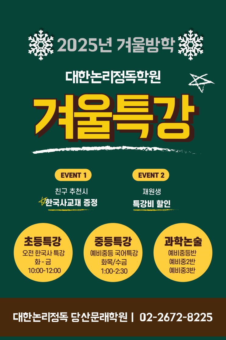 2025년 겨울방학특강 안내해드립니다! 초등 한국사 -- 특강 기간: 26. 1. 13 ~ 26. 2. 13 -- 수업 시간: 화~금 오전 10:00 ~ 12:00, 총 20회 수업 -- 수업 대상: 초등 4학년 ~ 6학년 -- 수업 내용: 선사시대부터 한국전쟁까지 한국사 총정리, 교재 정독, 선생님 설명, 서논술형 문제, 글쓰기 2. 예비 중등 국어 -- 특강 기간: 26년 1월 ~ 2월 -- 수업 시간: 화목 1:00 ~ 2:30 / 수금 1:00 ~ 2:30 중에서 선택 -- 수업 대상: 초등 6학년 -- 수업 내용: 중등 국어 개념 총정리, 중등 교과서 수록작품 정독, 분석, 서논술형 글쓰기 3. 중등 과학 논술 -- 특강 기간: 26년 1월 ~ 2월 -- 수업 시간: 미정 -- 수업 대상: 초등 6학년, 중등 1~ 2학년 -- ....... <img src="https://blogthumb.pstatic.net/MjAyNTEyMTZfMTEx/MDAxNzY1ODY3NDAxNjg0.R1wmdS5Ky4_ZgV4Lxli24ZUQMmO_hnRondpxOs9RUyAg.Dsk8dFUhfplnT1vdZX2HHjMI8e7RLIR3pIN3MpINzLog.JPEG/2025_%B0%DC%BF%EF%B9%E6%C7%D0%C6%AF%B0%AD_%C0%FC%B4%DC.jpg?type=s3" />