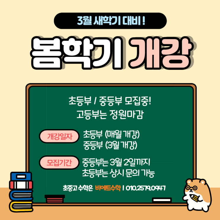 안녕하세요. 겨울방학을 놓친 학생들을 위한 3월 새학기반 모집이 시작되었습니다~^^ 초등부의 경우 여석에 따라 매월 상시개강하고 있으며 중등부의 경우 이번 봄학기반은 3월 2일까지 모집하고 있습니다. 진단테스트가 필수이므로 관심있는 학생들은 미리 연락해서 수업시작에 늦지 않도록 준비해보아요. 중등부는 이번 개강을 놓치면 5월에 개강하기때문에 3월반 꼭 챙기시길 바랍니다! <img src="https://blogthumb.pstatic.net/MjAyNjAyMjRfMTM4/MDAxNzcxOTE2NzY1NTU5.DozvvEg0vKZTU9L_TDqWeZynd3SEggyGNmQsVuth7Msg.J3sLerCQBUeV6_sFftRCE7-PuXT-avLL-t5aBYhOxGMg.PNG/%C1%A6%B8%F1%C0%BB_%C0%D4%B7%C2%C7%D8%C1%D6%BC%BC%BF%E4._%284%29.png?type=s3" />