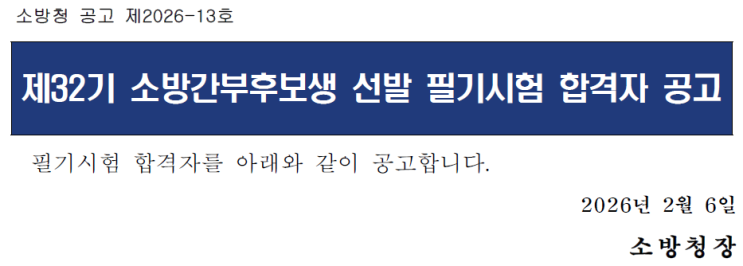 32기 소방간부후보생 필기시험 합격컷 공개! 최적의 준비 방법은? 지난주, 제32기 소방간부후보생 필기시험 합격컷이 공개 되었습니다. 생각보다 많은 인원이 시험에 응시하였고, 필기합격의 문턱에서 기쁨 또는 좌절을 느끼신 분들이 꽤나 있을거라 생각이 됩니다. 필기시험 결과를 한 번 살펴보면, 총 응시생은 614명으로 필기합격생(62명) 수의 약 10배수에 달하는 인원이 시험에 응시했습니다. 숫자로만 봐도, 올해 필기 경쟁이 결코 만만치 않았다는 점이 느껴집니다. 인문사회계열의 경우 남 336점, 여 308점 자연계열의 경우 남 268점, 여 260점으로 합격컷이 갈렸습니다. 같은 필기시험일지라도 속한 계열과 성별에 따라 합격선의 체감 난....... <img src="https://blogthumb.pstatic.net/MjAyNjAyMTNfMTYg/MDAxNzcwOTY0MDA4MzU3.UmXKO19AtH28F87K7k6cgT_cj2_0-896dMbhFZP8ZHwg.DhthGdc-37zwtQxLYsd_lZgtUW6Uw5NU_FPFKVrLEVog.PNG/%C8%AD%B8%E9_%C4%B8%C3%B3_2026-02-13_152619.png?type=s3" />