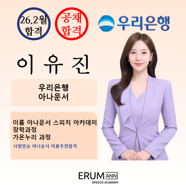 경력을 쌓다가 막혔을 때 이룸을 찾는 지원자들이 꽤 많습니다. 그럴 때마다 기본기를 점검하고 방향을 함께 잡아서 집중할 곳에 집중을 하다보면 또 다른 길이 열리곤 합니다. 이유진 아나운서도 지역에서 금융권 사내아나운서를 쭉 하다가 잠시 붕 뜬 시간이 있을 때 이룸에서 장학반과 심화반을 수강하면서 새로운 길을 모색했습니다. 합격 소감을 전해왔는데요 함께 볼까요!? 지난해 이룸을 만나게 된 건 무척 행운이에요! iM뱅크에서 아나운서로 활동하며 실무 경험을 쌓았지만 안주하지 않고 역량을 더 발전 시키고 싶어서 학원을 찾게 되었습니다. 혼자 이직을 준비하던 시점에 마침 이룸 장학반에 들어가게 되었고, 원장님과 선생님들께....... <img src="https://blogthumb.pstatic.net/MjAyNjAyMjNfMTMx/MDAxNzcxODM4Nzg1MDA2.3mkO6LN9Qn2hJ34_NPuLFjT_plNHOFSj8nAdKebchkkg.6ZHL6OfZWmDgIQbSrTx1LgOYhLYALXrQdOUbpHCfQgwg.PNG/%BD%BA%C5%A9%B8%B0%BC%A6_2026-02-20_154103.png?type=s3" />