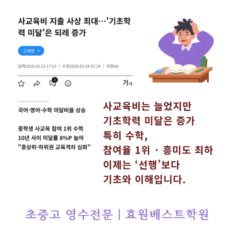 [ 창원 동읍 영어 수학 전문 효원베스트학원 ] 사교육비는 늘었지만 기초학력 미달은 증가