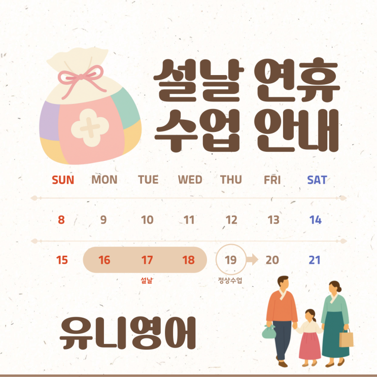 설날 연휴 동안 가족들과 따뜻한 시간 보내시고, 편안한 마음으로 연휴 이후 우리 친구들 수업에서 다시 만날게요. 설날 연휴 휴강 일정 안내 ✔ 휴강일 2월 16일(월) ~ 2월 18일(수) 설날 연휴로 휴강입니다. ✔ 정상수업 2월 19일(목)부터 정상 수업 진행합니다. <img src="https://blogthumb.pstatic.net/MjAyNjAyMTBfMTI3/MDAxNzcwNzE1MjYwNDM0.0ecF6ccFjs5URkVnFX6LHUIruqAxADmeYMCqJfO3gKQg.Ckm_G-S2Tmh6LTS11svu_vx6ICjWD75zACxheKvMo98g.PNG/2026%BC%B3%BF%AC%C8%C4.png?type=s3" />
