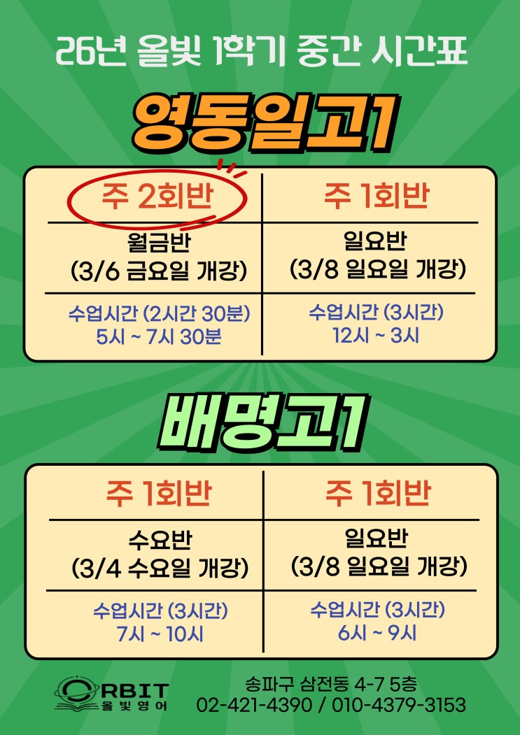 [삼전동 고등 영어전문] 2026년 올빛영어 1학기 중간고사 시간표