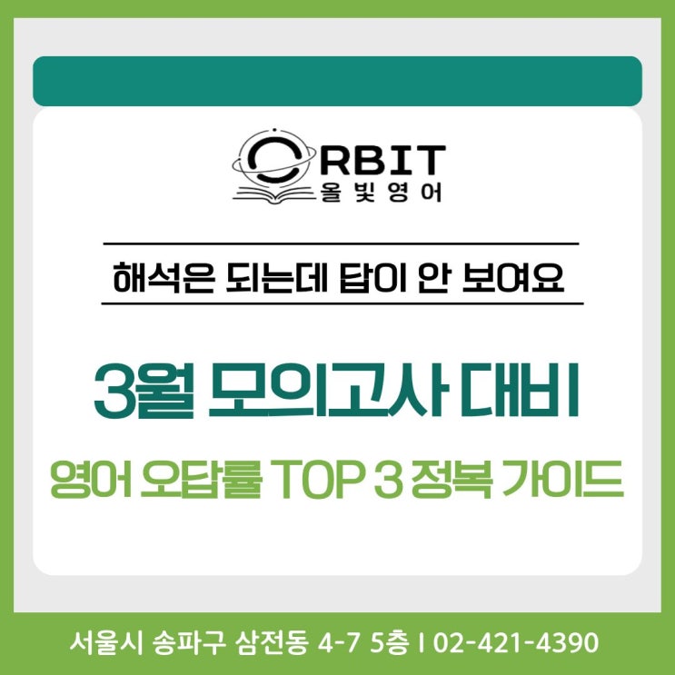 안녕하세요! 잠실학원사거리 중고등 영어전문 올빛영어입니다! 2026년 3월 모의고사가 3월 24일 화요일에 치뤄질 예정인데요. 3월 모의고사는 겨울방학 동안의 학습 성과를 확인하는 첫 관문이죠. 오늘은 많은 학생들이 공통으로 어려워하는 세 가지 유형을 분석하고, 출제자의 시각에서 바라본 대처 방안을 제시합니다. 1. 빈칸 추론 (Blank Completion) "나무가 아닌 숲을 보라" 학생들이 가장 시간을 많이 뺏기고 오답률도 가장 높은 유형입니다. 빈칸에 들어갈 말을 지문 밖에서 '상상'하려 하기 때문에 함정에 빠집니다. (1) 어려운 이유: 지문의 추상적인 소재와 난해한 어휘 때문에 문장 자체를 해석하는 데 급급해 전....... <img src="https://blogthumb.pstatic.net/MjAyNjAzMTlfMTk5/MDAxNzczOTIwMjc1NDMx.quFoEKO6w-OVsEymQboZqxMQsyK9QKLTbwbdGe1s5Vsg.ztzFU00vOaAESLj6feyFJ6k-XGzFgC9W8kVBRbp-EM4g.JPEG/%BA%ED%B7%CE%B1%D7_%C7%A5%C1%F6_%2811%29.jpg?type=s3" />