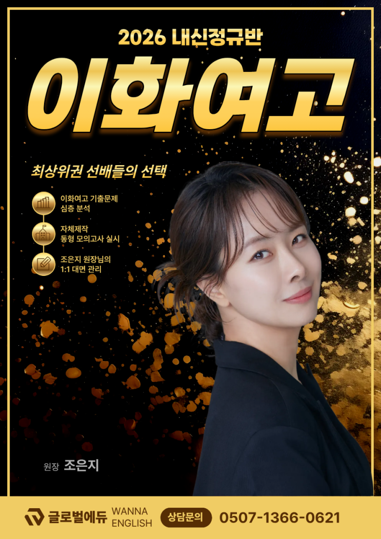 안녕하세요! 글로벌에듀 학원입니다! 조은지 원장님의 140기 이화여고 토요일 오후 2시 내신정규반 인원이 마감되고, 추가 개설되었습니다!!! 대기 중이던 학생들도 원장님의 수업과 관리로 열심히 중간고사를 향해 달려가고 있는 지금, 이화여고 학생들의 뜨거운 학구열에 힘입어 글로벌에듀 학원에서 작은 이벤트를 준비했습니다! 바로 '조은지 원장님 이화여고 재원생' 특별 생기부 컨설팅입니다! 이번 컨설팅은 글로벌에듀 입시 컨설팅 대표 김진현 대표님께서 이화여고 학생과 학부모님을 대상으로 1:1로 진행해주실 예정입니다~ 글로벌에듀 입시컨설팅 대표 김진현 University of Pennsylvania 한국외대 영어과 대원외고 졸업 대....... <img src="https://blogthumb.pstatic.net/MjAyNjAzMTlfMjgz/MDAxNzczODcxNzAxMDg3.ctcH73md-HR1ztmoK58ATVJXnu-5vLEbt7HHNjNP5bwg.4KSBRariqXtUjp4LdRIQCxACF82qv3u7GbWnKcRWrqog.PNG/%C1%A6%B8%F1%C0%BB_%C0%D4%B7%C2%C7%D8%C1%D6%BC%BC%BF%E4._%281%29.png?type=s3" />