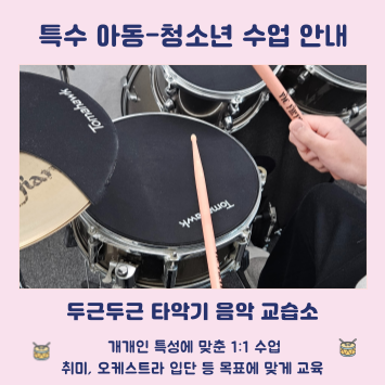 안녕하세요. 신고 제1815호 두근두근 타악기 음악 교습소장 하트샘입니다. 오늘은 저희 교습소에서 진행하고 있는 특수 아동, 청소년 수업을 소개해드리려고 해요. 두근두근 타악기에서 함께하는 특수 아동-청소년 수업 다양한 타악기를 활용한 학원을 운영하다보니 꽤 많은 수의 특수 아동-청소년 친구들을 만나고 수업을 진행해 왔습니다. 그 중 소수는 정규 수업으로 꾸준히 진행하고 있으며 각자 속도에 맞춰 즐겁게 성장하고 있습니다. 오케스트라 입단을 목표로 소통과 자립의 기회 지원! 최근 정부에서는 발달, 뇌병변, 시각 장애 등 다양한 장애를 가진 연주자들이 음악을 통해 사회와 소통하고 전문 연주자로서의 기회와 자립을 할 수 있....... <img src="https://blogthumb.pstatic.net/MjAyNjAyMDlfMjgx/MDAxNzcwNjI4NDM1ODI0.d6ArcqM5SKMu54pTnLM4-Fp8Gn9JNJYSDvnnkLl7OFIg.tVQpAqJ4uuRoC_MT9H9o14eQ_UXGn6YBqNYHn-btQ1sg.PNG/KakaoTalk_20260209_180923125.png?type=s3" />