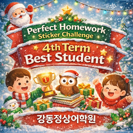 안녕하세요, 정상어학원 강동분원입니다! 2025년의 마지막 학기, 4th term에도 강동분원에서는 CHESS 학생들과 함께 Perfect Homework Sticker Challenge를 진행했습니다! 한 학기 동안 매일매일 숙제를 성실히 해 오고, 스티커를 하나씩 차곡차곡 모아온 우리 학생들 모두에게 먼저 큰 박수를 보냅니다~ 그 꾸준함과 성실함 자체가 이미 충분히 멋진 성취였습니다! 반별 Best Student 선정! 이번 챌린지를 통해 각 반에서 가장 많은 스티커를 모은 학생을 반별 Best Student로 선정하였습니다. 숙제를 꾸준히 해내는 습관, 자기 관리를 끝까지 해낸 태도는 영어 실력뿐만 아니라 학습 전반에 꼭 필요한 힘이기 때문에 강동분원에서....... <img src="https://blogthumb.pstatic.net/MjAyNTEyMTZfMzAg/MDAxNzY1ODg1ODk5NjUx.VNlwF4GuJ7z0Jh5ovzCFGBBZUqalzOSY5Vvzq87-zI0g.IC1x_lduNB8oOGft82A2lBndEjOqsko7o83nZJ9bO14g.PNG/image.png?type=s3" />