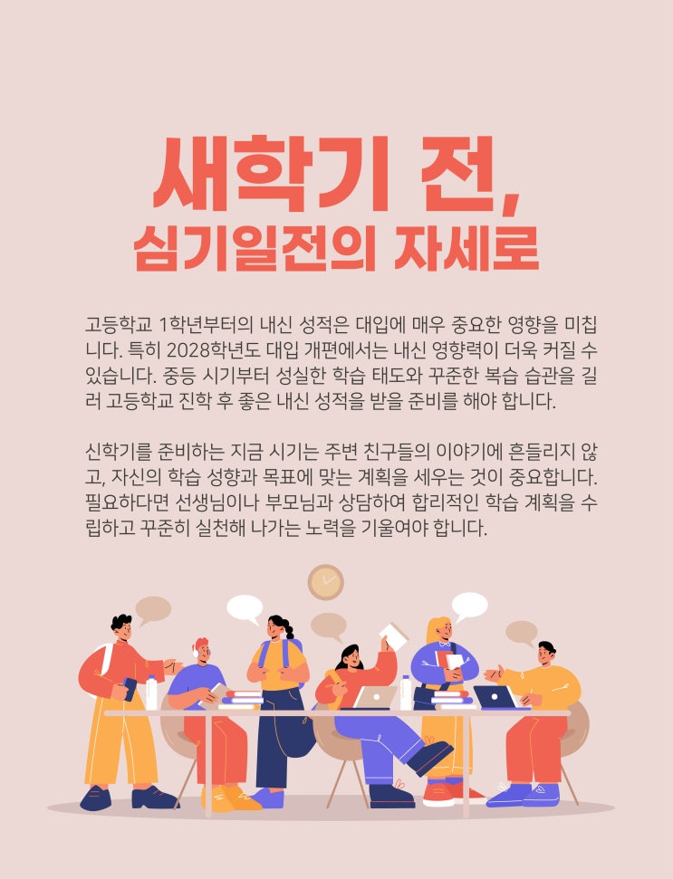 통영 메카수학 | 새학기 전, 심기일전의 자세로 시작하는 중등 수학 학습 전략 새학기는 단순한 시작이 아니라 고등학교 내신을 결정짓는 출발선입니다. 특히 고등학교 1학년부터의 내신 성적은 대입에 직접적인 영향을 미치기 때문에, 중학교 시기부터의 학습 태도와 기본기 완성이 무엇보다 중요합니다. 최근 2028학년도 대입 개편안에서 내신 영향력 확대가 언급되며, “언제부터 준비해야 할까?”라는 질문을 많이 받습니다. 정답은 분명합니다. 지금, 바로 지금입니다. ✏️ 무리한 선행학습보다 중요한 것은 ‘심화 학습’ 고등학교 과정을 미리 공부하는 선행학습도 도움이 될 수 있지만, 중학교 내용을 완벽히 이해하지 못한 상태에....... <img src="https://blogthumb.pstatic.net/MjAyNjAxMDlfNDEg/MDAxNzY3OTM1MzY0NDE0.RZA430u3zTeytXv8T4c4t2j7in-ylIX6OsR4ZWIfu4Qg.Z5rUsr7CGKldralbKVD3GQBSm8KEvHlqztd5t0isksYg.JPEG/260112_%BF%F9%BF%E4_%C4%AB%B5%E5%B4%BA%BD%BA.jpg?type=s3" />