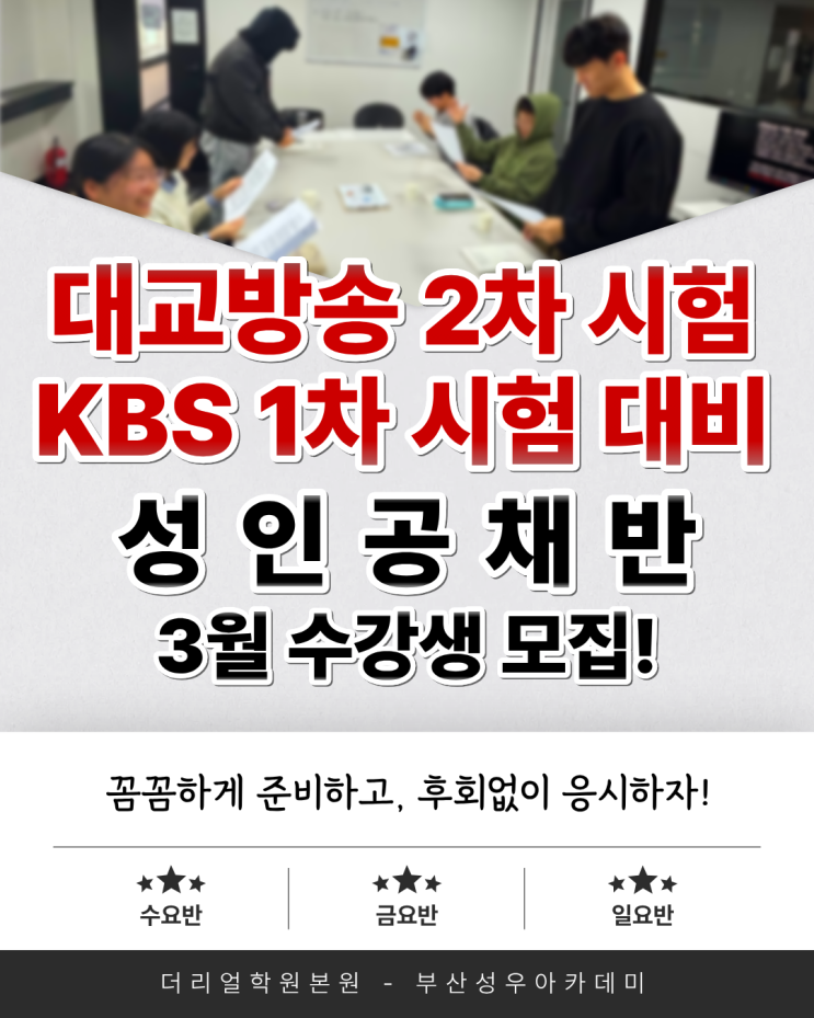 [더리얼학원본원-부산성우아카데미] 공채시험은 대비, 대비, 또 대비해야해! 대교2차시험/KBS 1차시험 대비 성인공채반 3월 모집 중!