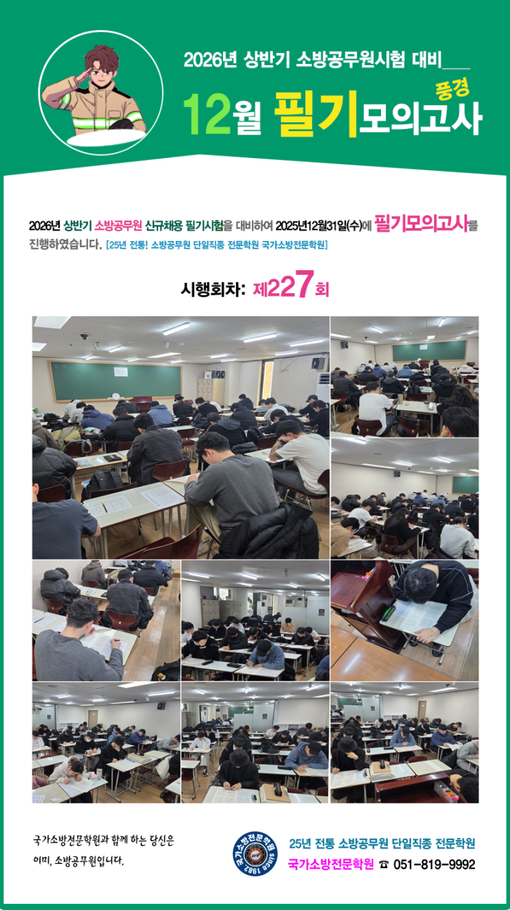 26년 소방공무원시험 대비 국가소방전문학원 12월 필기모의고사 풍경 <시행일: 2025년12월31일(수)> #소방학개론모의고사, #소방관계법규모의고사, #소방행정법총론모의고사, #응급처치학개론모의고사, #소방공채모의고사, #소방경채모의고사, #소방구조모의고사, #소방구급모의고사 2026년 상반기 소방공무원 신규채용 필기시험 대비 공개경쟁분야, 구조분야, 구급분야, 소방학과분야 모의고사를 2025년12월31일(수) 시행하였습니다. 12월 필기모의고사에 응시하신 모든 분들의 최종합격을 진심으로 소망합니다. >> 26년 1월 소방공채 및 소방경채 필기모의고사: 1월28일(수) 예정 25년 전통, 소방공무원 단일직종 전문학원 필기+체....... <img src="https://blogthumb.pstatic.net/MjAyNTEyMzFfMjY2/MDAxNzY3MTY0OTAxMDYy.x0OpXn-RMcYxSx-sbsj4PNqA2hKwf8bW6rcWSXJVqs0g.j2ulimMR8BeewvW7xrNjDAGzexuSUzGF6Wk9mC20zNcg.PNG/25_12_exam.png?type=s3" />