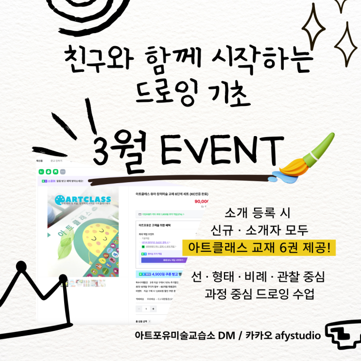 아트포유 3월 추천 이벤트 안내 드로잉 기초 강화 · 교재 6권 제공 3월에는 드로잉 기초를 다시 정리하는 기간으로 운영합니다. 결과를 빠르게 만드는 수업이 아니라 선의 방향, 형태의 구조, 비례와 위치 감각을 차분히 다지는 과정 중심 수업입니다. 관찰력과 표현력을 기초부터 안정적으로 쌓을 수 있도록 아트클래스 교재를 활용한 단계별 프로그램으로 진행합니다. 3월 추천 · 신규 등록 이벤트 3월 한정 운영 3월 말 마감 지인 소개로 신규 등록 시 신규 등록생과 소개자 모두 아트클래스 교재 6권 제공 교재는 단순 증정이 아닌 정규 프로그램 구성 안에서 함께 진행됩니다. 아이의 표현 기초를 제대로 시작하고 싶다면 3월이 가장 안정적....... <img src="https://blogthumb.pstatic.net/MjAyNjAyMjVfMTE4/MDAxNzcyMDE3MzU2Njcz.hmCw6RpnfVTIHNn1OZfHKvrM3-JZbRTekL2rqeri4zUg.ycMcsfZZNXwR5vqAh2I27egqmQh2O8EoDxAk4Brqo1og.PNG/%C0%CC%BA%A5%C6%AE.png?type=s3" />