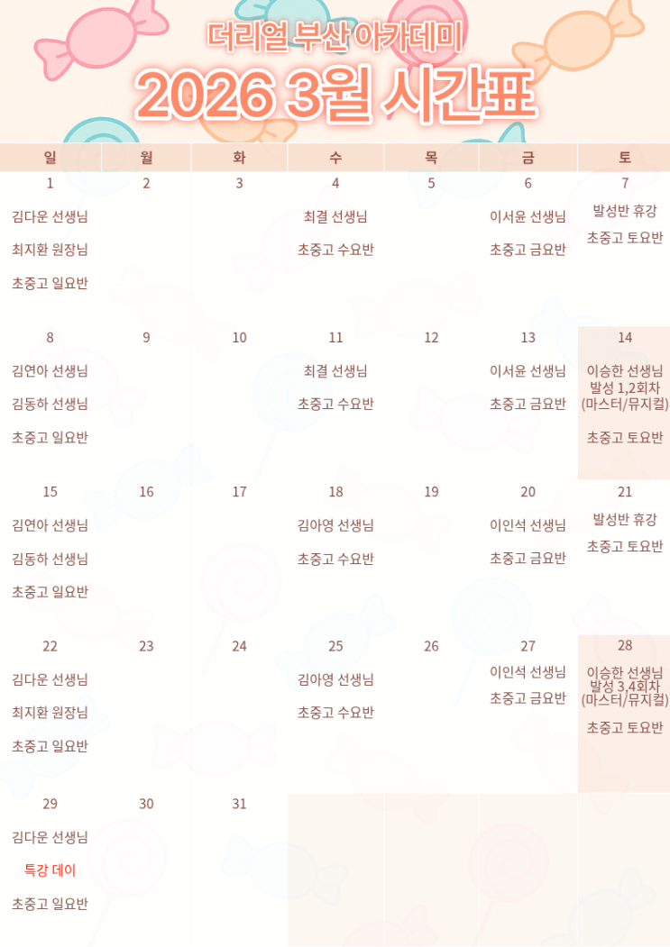3월 시간표가 나왔습니다~ 취미로 시작하고 싶은 분들부터 발성부터 차근차근 배우고 싶은 분, 그리고 목표를 두고 꾸준히 준비 중인 분들까지 각자 일정과 단계에 맞춰 수강하실 수 있도록 구성되어있답니다! 수업 관련 궁금한 점이나 수준·반 선택이 고민되신다면 언제든 편하게 문의 주세요 수업 안내도 함께 도와드릴게요! (정원 제한이 있는 수업도 있으니 참고 부탁드립니다!) 앞으로도 재밌게 배우고, 꾸준히 성장할 수 있는 수업으로 찾아뵙겠습니다 ️✨ 많은 관심 부탁드려요! 신청 및 문의는 아래 링크로! https://pf.kakao.com/_xdxcxiMb/chat 원생들의 수업현장이 궁금하다면? ↓↓↓↓↓↓↓↓ https://blog.na....... <img src="https://blogthumb.pstatic.net/MjAyNjAyMjVfMjAz/MDAxNzcyMDA1ODU0NTkz.kCG8iKW0hr57pzs1sCNFWmjzR1-V7M_lbUNTFHC-Kokg.NJ7fBvLF08CAzTWTBHCUfo25_ZLo1cTMp2h11wpVea0g.PNG/2%BF%F9_%BD%C3%B0%A3%C7%A5-_%BA%B9%BB%E7%BA%BB.png?type=s3" />