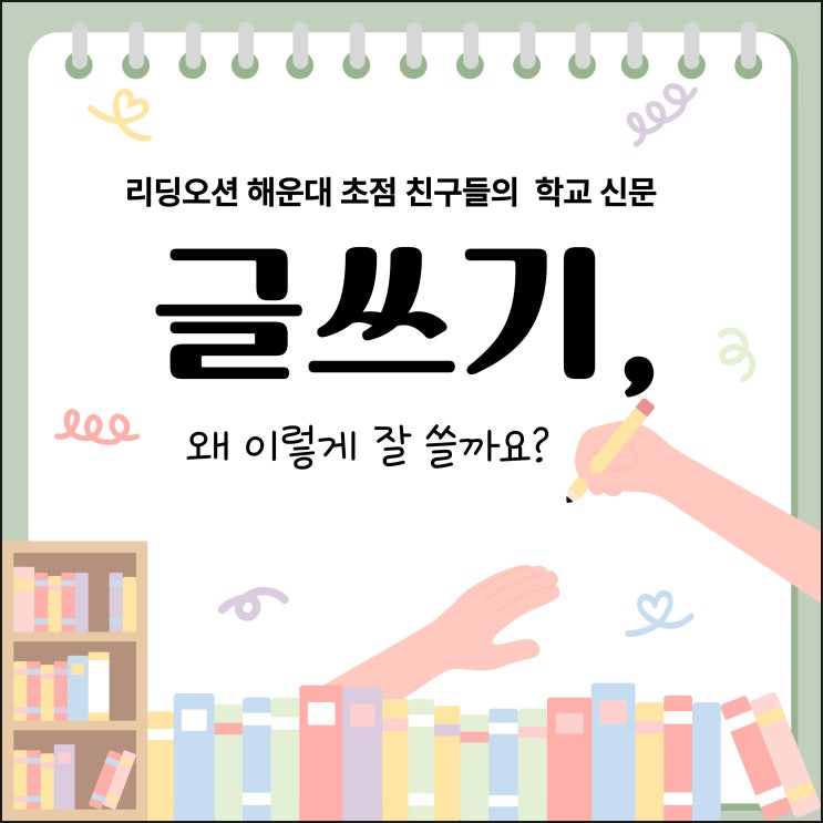 학교 소식지 글 응모 소식 내용 작년 12월 해운대 초등학교 소식지인 학교 신문에 올릴 원고를 학생들 대상으로 모집했고, 우리 리딩오션 친구들이 원고 응모를 했습니다. 세 가지 형식 중 자유 소재로 하였습니다. 부끄럽다고 안 나가겠다는 친구들도 있었지만 용기 있는 친구들은 원장 선생님과 함께 첨삭해서 원고를 제출했고, 너무나 예쁜 글들로 학교 신문에 올려졌습니다. 학부모님들도 생각도 못 했는데 우리 아이들 글이 올려져서 고맙다고 인사도 왔고, 우리 친구들 글이 학교 신문에 딱 실려 있으니 선생님도 행복했습니다. 선생님 믿고 열심히 글쓰기 해 준 친구들 너무 고맙습니다. 항상 믿고 응원해 주시는 학부모님과 학생들 모두....... <img src="https://blogthumb.pstatic.net/MjAyNjAyMjJfODkg/MDAxNzcxNzY2NzI1NDk3.m8x6NfP8dqLCx85o4wnpQX-agkXra8Zy4tMgLGrzLAgg.8_CiukhNxfNHoBniOG-pN0qW1W0Y_sAaiVq5yApo2uAg.JPEG/%C1%A6%B8%F1%C0%BB-%C0%D4%B7%C2%C7%D8%C1%D6%BC%BC%BF%E4_-001_%2880%29.jpg?type=s3" />