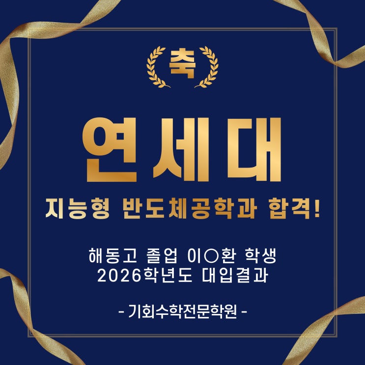 안녕하세요, 기회수학학원 입니다. 중등 수학까지는 성적이 잘 나오다가 고등학교 올라가서 무너지는 아이들, 혹은 끝없는 선행 진도에 지쳐 정작 내신 성적은 나오지 않는 아이들을 보며 부모님들의 고민이 깊으실 줄 압니다. 오늘은 상위 4%만이 1등급을 받던 시절, 가장 어렵다는 미적분에서 당당히 1등급을 거머쥐고 연세대학교 지능형 반도체공학과에 합격한 학생의 이야기를 통해 그 해답을 드리고자 합니다. 1. 고등 수학, '누구에게 어떻게' 배우느냐가 성패를 가릅니다. 고등학교 수학은 중학교 때와는 차원이 다른 사고력을 요구합니다. 단순히 유형을 암기하고 반복하는 형태로는 한계가 명확하죠. 이 학생 역시 한때 수학....... <img src="https://blogthumb.pstatic.net/MjAyNjAzMjNfMjYy/MDAxNzc0MjQzMzM2NjE4.4T5Syk6YX6mT9YL4EgX-UsO0eX_yCEVwEhR40DrMtg8g.S0nM1geyCREKOphNyKaqx15q8onzmwYg7i9Bwl95AzIg.JPEG/KakaoTalk_20260322_211303052_01.jpg?type=s3" />