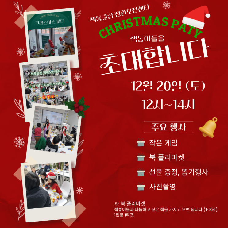 12월 20일, 12시 우리 아이들과 특별한 시간을 준비합니다 – 크리스마스 파티 안내 안녕하세요, 책통클럽 정관모전센터입니다~^^ 한 해를 마무리하는 12월, 아이들과 함께 따뜻하고 기억에 남을 시간을 보내기 위해 크리스마스 파티를 준비하고 있습니다. 올해는 12월 20일 토요일 낮 12시, 수업 외 시간에 별도로 아이들을 초대합니다. 이 시간은 단순한 '이벤트'가 아닙니다. 아이들의 마음속에 함께 웃고, 나누고, 기억에 남는 배움의 공동체를 심어주고 싶은 마음에서 출발했습니다. 학원은 공부만 하는 곳이 아니라, 서로에게 응원이 되고 힘이 되는 관계가 자라는 곳이기도 하니까요. 물론, 평소 수업 외 시간을 따로....... <img src="https://blogthumb.pstatic.net/MjAyNTEyMTVfMjcy/MDAxNzY1NzkzOTM1Nzg5.mbVHhCWbn9DrHWqUXFyg60-AEMkEPIj1AG1veHqB89Qg.pufX3DiSM18yqs5RAfoFKlTiF3_HeieD8VcS8V0w_YMg.PNG/%C1%A6%B8%F1%C0%BB-%C0%D4%B7%C2%C7%D8%C1%D6%BC%BC%BF%E4_-003.png?type=s3" />