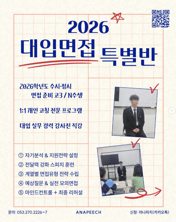 안녕하세요, 아나피치예요! 대입면접은 준비 방향이 합격을 좌우한다는 사실. 우리 학생분들은 알고 계셨나요?! 아나피치에서 확실한 방향을 잡아보세요 :) 정시면접 · 수시면접 모두 가능한 대입면접 특별반이 개설됐거든요! 대입면접은 단순히 말을 잘하는 연습이 아닙니다 짧은 시간 안에 전공 적합성, 사고력, 태도, 인성을 정확히 전달해야 하는 고난도 평가예요! 아나피치 대입면접 특별반은 정시·수시 전형별 면접 유형을 철저히 분석해 학생 한 명, 한 명에게 맞춘 1:1 맞춤 피드백 중심 수업으로 진행돼요 ✔ 정시면접 · 수시면접 모두 완벽 대비 학생부 기반 면접 / 제시문 면접 / 심층·인성 면접 전 유형 대응 대학·학과별 질....... <img src="https://blogthumb.pstatic.net/MjAyNjAxMDhfMjkx/MDAxNzY3ODM4NjczOTMx.f3F6f3UEvoN8me8zA4woIjeGbsuonVbLjafv1L_ipu0g.Aq2lVReJ8pHYykY1NrHlqNP1MFkwDIorGaJDKg3gw1wg.JPEG/%B4%EB%C0%D4%B8%E9%C1%A21.jpg?type=s3" />