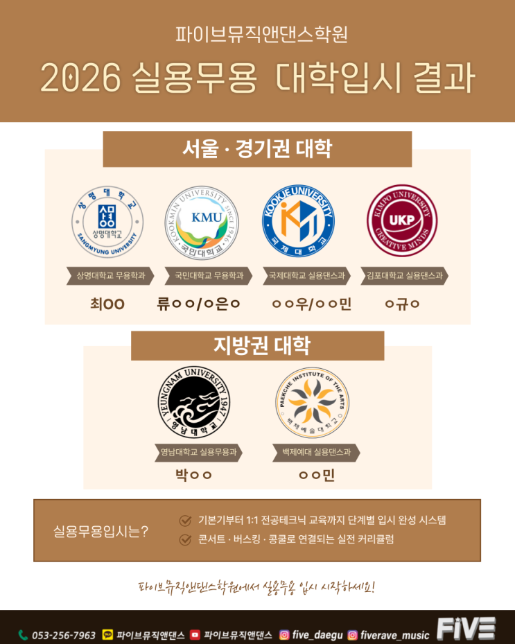 대구 실용무용학원 2026 대학입시 결과 | 서울·경기·지방권 합격정보 알려드려요 안녕하세요! 대구파이브뮤직앤댄스학원이에요^^ 지금 보여드리는 영상들의 공통점은 뭘까요? 정답은? 모두 파이브 댄스 전공반 수강생들의 무대라는 점이에요 댄스 전공반 영상과 함께 오늘은 2026학년도 실용무용 대학입시 결과를 알려드리려고해요 다양한 대학 실용무용과 합격을 함께 축하해주세요♥ ▲ 왁킹전공 (콘서트무대영상) ▲ 걸스힙합전공 (콘서트무대영상) ▲ 힙합댄스전공 (콘서트무대영상) 서울·경기권 대학합격 상명대학교 무용학과 국민대학교 무용학과 국제대학교 실용댄스과 김포대학교 실용댄스과 서울 경기권의 수도권 대학은 실기 완성도와....... <img src="https://blogthumb.pstatic.net/MjAyNjAyMjVfMTcy/MDAxNzcyMDEzNjEzMjQx._VqnwioUxZLnloKilVstAOtfDneFGyxvQ9zgft9S2lIg.YByBZSqiTqiBX-677mwt4u9X7iryAhu6u1W81UcN--Ig.PNG/003.png?type=s3" />
