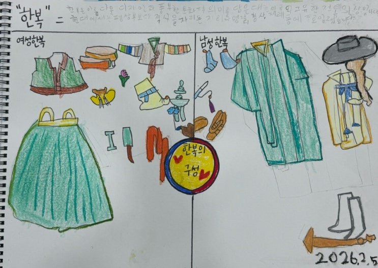 안녕하세요! 미송 미술입니다:) 오늘은 미송 미술 작가님들과 함께 우리나라의 전통의상인 ”한복“에 대하여 알아보고 각 성별에 따른 한복의 구성에 대해 배운 뒤, 직접 그림️을 그려보는 시간을 가졌어요! 관찰하고 배운 것을 토대로 그려준 뒤 작가님들이 원하는 색깔과 문양으로️ 채색하고 그려주어 더 멋진 한복을 만들어주었어요! 배경까지 아주 귀엽고 기발하게 꾸며주었어요! 한복과 배경 둘 다 너무 곱게 표현해 준 친구의 작품이에요! 미송 미술 꼬마 작가님들 모두 아주아주 열심히 그려주었답니다! 모든 수업 상담 문의는 ☎️ 010.7288.2527로 부탁 드립니다! <img src="https://blogthumb.pstatic.net/MjAyNjAyMjZfMjYx/MDAxNzcyMDg0ODA5NzYy.bKU2_YyR89OZZEf7V5fFtQw_V4XsEE_5NVks7Rgpp1og.SfkOphFkCTmxQL_Ieule2eAILLfi_Bibu8WqW6BDx9gg.JPEG/output%A3%DF670916575.jpg?type=s3" />