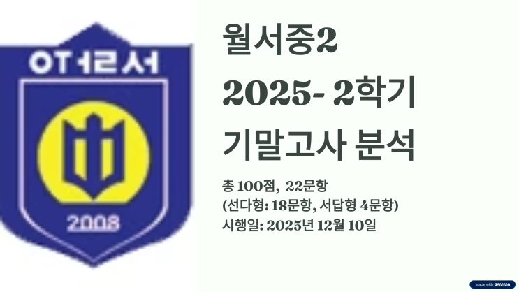 안녕하세요 대구 달서구 월성동수학학원 신사고학원 원장 이재창입니다. 2025년 월서중학교 2학년 2학기 기말고사 실제 시험지를 완벽 분석했습니다. 예비 중2 학생과 학부모님들이 꼭 알아야 할 도형의 닮음과 확률 실전 공략법을 문제 하나하나 짚어드리겠습니다. 기말고사 총평 월서중학교 2학년 2학기 기말고사는 도형의 닮음(약 40점)과 경우의 수·확률(약 26점)이 핵심 단원입니다. 난이도는 기초 30%, 표준 40%, 응용 25%, 심화 5%로 표준 문제 중심의 균형 잡힌 시험입니다. 가장 중요한 것은 서답형 34점(전체의 34%)입니다. 닮음의 성질 증명, 평행선과 선분의 비, 삼각형의 무게중심, 경우의 수와 확률 계산 등 핵심 개념을 종합적으....... <img src="https://blogthumb.pstatic.net/MjAyNTEyMTRfMzIg/MDAxNzY1NzEwMzM3MjQ4.mZU4SOqWmhvJ3Q6_vb0nfxIzWbCsOWnaoLx-OIpUILMg.HRZTVbnVDsqtCLD0ajTO22ilQ5Ku2b6Y83iuZjn7OK8g.PNG/2_%284%29.png?type=s3" />