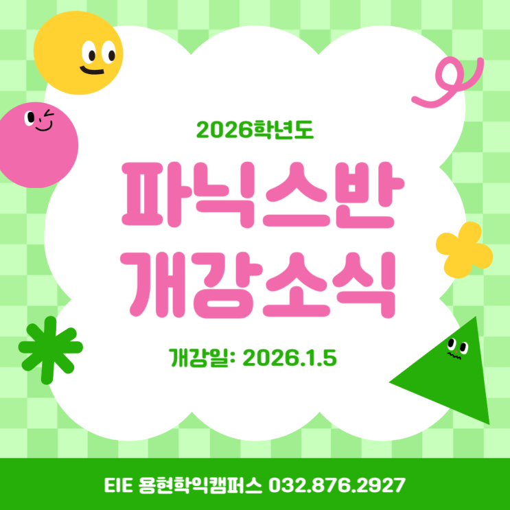 안녕하세요. 용현동 영어학원 EIE 고려대학교 국제어학원 용현학익 캠퍼스입니다. 2025년의 끝자락, 모두 따뜻한 연말을 보내고 계신가요? 한 해를 마무리하는 동시에 eie 용현캠에서는 새학기 준비도 바삐 이루어지고 있는데요. 파닉스하면? EiE!! 2026학년도 새학기를 맞아 파닉스반의 개강소식을 이웃님들께 가장 먼저 알려드려요! 초등부부터 시작되는 파닉스, 이때 잘 공부해야 나머지 시간이 탄탄하다는 것. 잘 알고 계시죠? 오늘은 파닉스 반 개강소식과 더불어 EIE의 수업을 소개해드립니다 ㅎㅎ 2026년 1학기 ☆★초등부 파닉스반 개강소식★☆ 개강일: 2026년 1월 5일 월요일 수업시간: 2:40-3:30 매일반 수업구성: 원어민3시간 + 한국....... <img src="https://blogthumb.pstatic.net/MjAyNTEyMDhfNjQg/MDAxNzY1MTc1MjQwMDc2.HtfFQwuuKGvKxWOHlWK48_ucz6C7-mZdf8awUYGrOuAg.CVH8Qu9NJgLzI5qNL5khGuw9je7zwxVoS2D4OXtCSZgg.PNG/%C1%A6%B8%F1%C0%BB_%C0%D4%B7%C2%C7%D8%C1%D6%BC%BC%BF%E4_-001_%283%29.png?type=s3" />