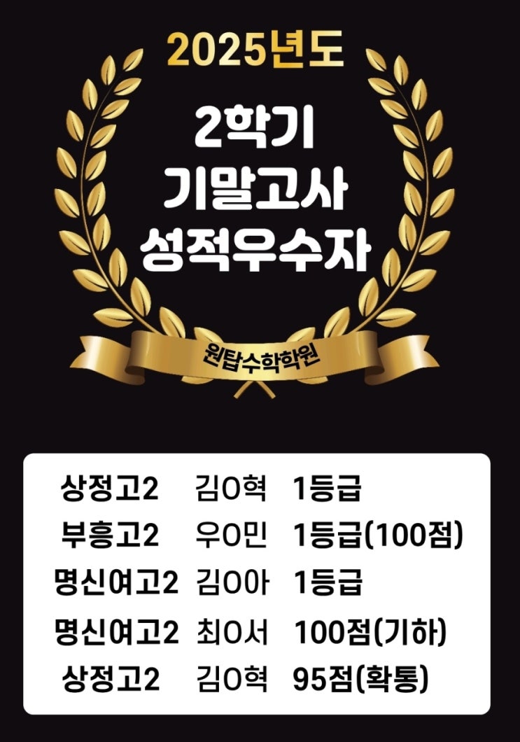 2025년 기말까지 모든 시험이 마무리 되었습니다! 끝까지 열심히 공부한 우리 원탑이들 대견하고 기특합니다 2026년의 시작! 새로운 학년, 학기 공부를 시작합니다! 조금 더 어려워진 수학이 힘들기도 하겠지만 곁에서 도와주시는 수달T와 함께 우리 화이팅해봅시다 #산곡동수학학원 #부평수학학원 #내신대비 원탑 #수학의달인 원탑 #수학은여기서 원탑 <img src="https://blogthumb.pstatic.net/MjAyNjAxMDNfMTQw/MDAxNzY3NDIwNzkwOTcy.Z7EyXScIqCT3Cr50Vq3o8KSo_ihKGSCOz4XuSkZhe7Ug.lr-5O7N0BkOBQ8Qtp583KCg9PbZF7_vc58kDj339HY0g.JPEG/900%A3%DF1767418842360.jpg?type=s3" />