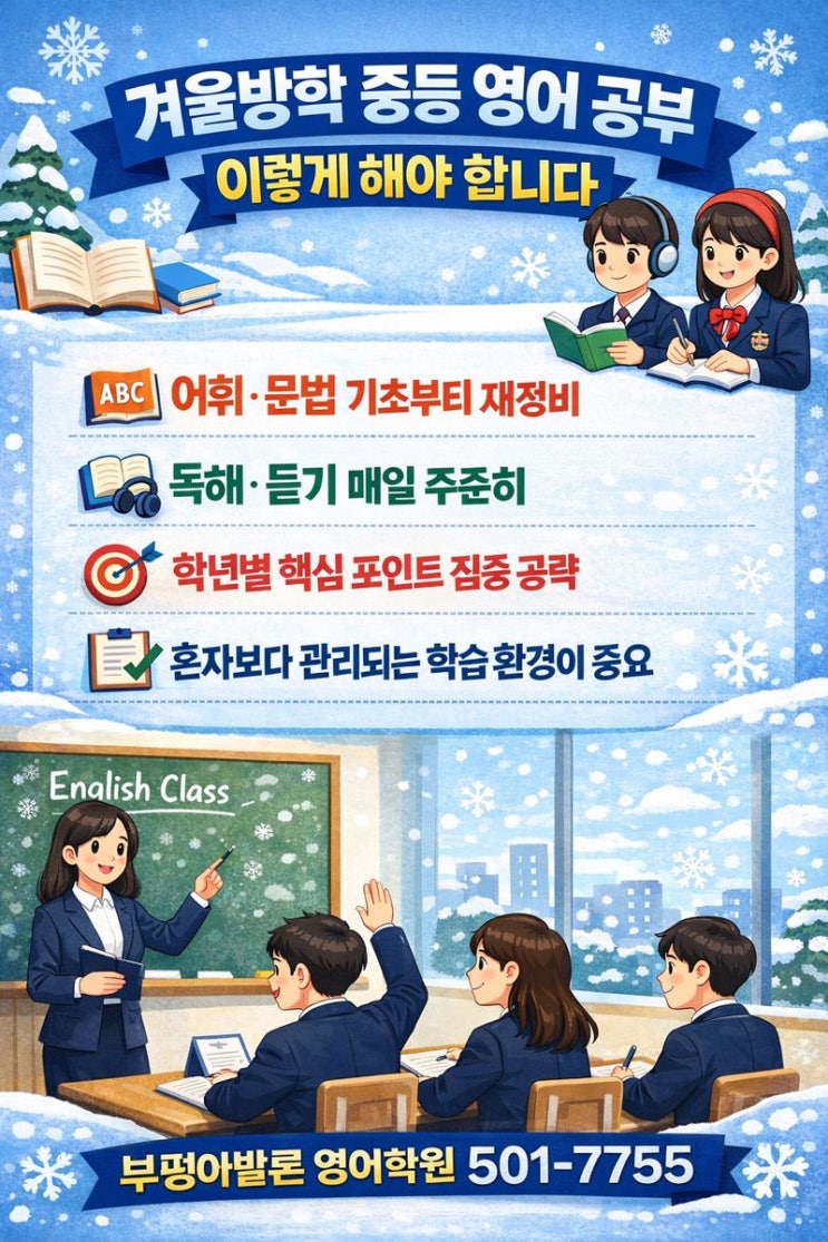 안녕하세요~ 내신, 특목, 수능전문 1등급 영어학원 부평아발론입니다. 부평아발론랭콘 어학원에서는 산곡동, 청천동, 가좌동, 부평동, 십정동까지 차량운행 되고 있습니다! 시간대별, 요일별로 차량운행지역이 다소 상이하니 차량운행여부를 먼저 확인해 주세요! 겨울방학은 중학생에게 영어 실력을 ‘점프업’할 수 있는 결정적 시기입니다. 학기 중에는 내신, 수행평가에 치여 부족했던 부분을 정리하기 어렵지만, 겨울방학만큼은 기본부터 차근차근 실력을 쌓을 수 있는 시간이기 때문입니다. 오늘은 효과적인 겨울방학 중등 영어 학습법을 알려드립니다~ ✅ 겨울방학 중등 영어 학습법 1. 겨울방학 영어 학습의 핵심은 ‘기본 완성’ 중....... <img src="https://blogthumb.pstatic.net/MjAyNjAxMDRfMTUg/MDAxNzY3NTI2NTY0ODU3.st-GFhuy11Bj7lGHryaKE_ttOE2iFQe_7RiDVPkaVGAg.l35Z5DQgn8cToZB-IVEI0yCoQNAc4VZtvl-5Nx3wTe4g.JPEG/d66e18ee-8eeb-4606-9b8e-e261d70e8a68-md.jpeg?type=s3" />