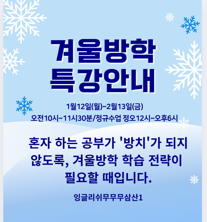 1. 왜 지금 우리 아이에게 전문가가 필요할까요? 집이라는 편안한 환경이 때로는 독이 됩니다. 초등,중등 시기의 학습은 단순한 지식 습득이 아니라 '몰입의 경험'과 '규칙적인 습관'이 핵심이기 때문입니다. 환경의 함정: 아무리 좋은 교재와 책상이 있어도, 혼자 있으면 스마트폰과 미디어의 유혹을 이기기 어렵습니다. 방치의 위험: 모르는 문제를 덮어두고 넘어가는 습관이 반복되면, 다음 학기 교과 과정에서 반드시 '학습 결손'이 발생합니다. 타이밍의 중요성: 이번 겨울방학에 잡지 못한 공부 습관, 새 학기가 되면 교정하기에 몇 배의 시간이 걸립니다. "혼자 하는 공부가 '방치'가 되지....... <img src="https://blogthumb.pstatic.net/MjAyNjAxMDVfMjk0/MDAxNzY3NTkzNzk3NzI3.dxMEaM-8acR_xSmuMnGx8ckHUTbJmjfgIeLovgZKvmMg.Fqir2R40kKBgVwf1-SF8Ki_8j_yjIQPimZlWX6IqZEQg.PNG/image01.png?type=s3" />