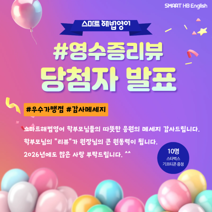안녕하세요? 스마트해법영어학원 버드내점 Sally입니다. 2026년 새해가 밝고 처음 글을 올립니다. 두근두근☺️ 괜시리 마음이 설레고, 떨리는 이 기분? 기쁜 마음 가득 담아서 좋은 소식 전합니다. 대전 지사에서 영수증 리뷰 이벤트 진행했었어요. 어머님들 바쁘셔서 미처 생각 못하시나보다 했었는데... 우리학원 이*리,이*리 학부모님, 당!첨! 교육비 결제 후 영수증이 필요하다 하셔서 빛의 속도로 손에 쥐어드렸어요. 그런데, 이렇게~~ 솔직, 담백한 리뷰를 남겨주실줄야.. 감사합니다. 다시 한번 마음을 잡고, 아이들의 소중한 시간들, 이 시기를 영양가 있는 수업으로 가득~ 채워보겠습니다. 스마트해법영어학원 버드내....... <img src="https://blogthumb.pstatic.net/MjAyNjAxMDJfNTYg/MDAxNzY3MzMyNjUxMjE0.ltM9w995uR0Q-yYCfgn7xzn1WwgMyvAoMrH3xJmHytYg.BhILDJ-b09q6U3f60PrvCgFk70TYqqXgi3xryt6zQCMg.PNG/900%A3%DFBandPhoto%A3%DF2026%A3%DF01%A3%DF02%A3%DF11%A3%DF41%A3%DF23.png?type=s3" />