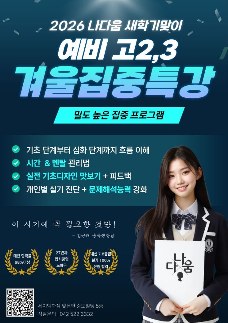 [대전입시미술학원] 합격하는 그림 그리고 싶다면? 2026 예비고2,3 겨울집중특강 모집