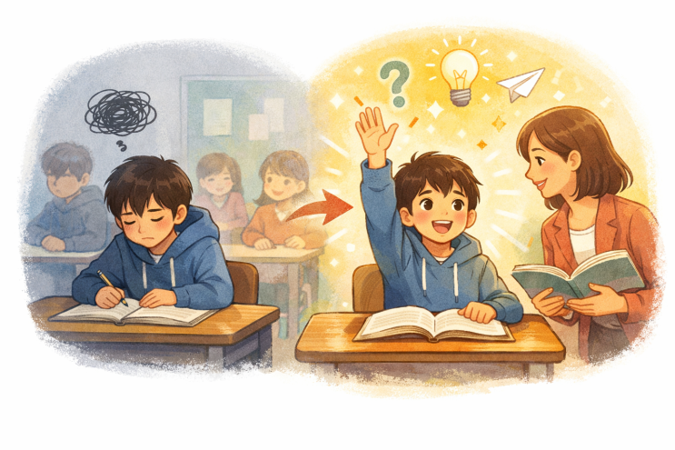 안녕하세요 대전 중구의 맞춤형 수학전문 다온수학학원입니다. 학원을 운영하다 보면 학생마다 정말 다양한 모습으로 수업에 참여합니다. 저희 학원에는 특히나 더 소극적인 친구들이 많은 것 같아요ㅎㅎ 오죽하면 하루에 몇십명씩 오고가는 학원인데, 왜 이렇게 조용한가요? 하는 질문을 받기도 합니다. (친구들끼리 우루루 몰려다니거나, 친구랑 떠드는 분위기가 전혀 아니라서 더더욱 그런 것 같아요.) 오늘은 그중에서도 ‘처음엔 말 한마디 없던 학생이 스스로 질문을 하기 시작하게 된 계기’에 대해 이야기해보려 합니다. 처음 만났을 때의 모습. 처음 상담을 왔을 때 그 학생은 질문은커녕, 고개를 끄덕이는 것 외에는 거의 반응이 없었....... <img src="https://blogthumb.pstatic.net/MjAyNjAxMDZfMjEz/MDAxNzY3Njc3NTA1OTU3.5y929bHMxMAA3Vc9I3ssecAROpcasWOMG0TBuBKZufAg.F_beUWfp4k6LRGRLhQZ2iH1lqUb16eKs1Z5ym6VlexQg.PNG/ChatGPT_Image_2026%B3%E2_1%BF%F9_6%C0%CF_%BF%C0%C8%C4_02_31_34.png?type=s3" />