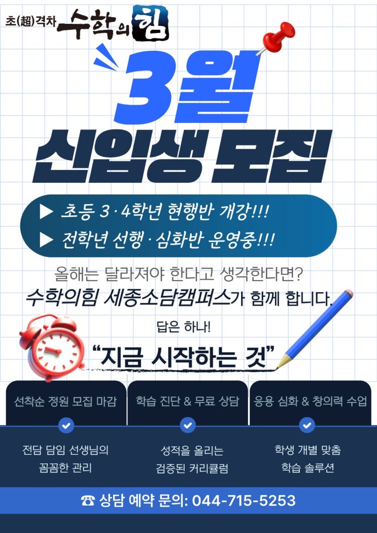 안녕하세요! ♥ 세종시 초중등 수학학원 ♥ 수학의힘 세종소담캠퍼스입니다 ;) 여러분, 3월 신입생을 모집하고 있어요~ 초등 3학년, 4학년이 현행반이 개강되었습니다!! 개강을 앞두고 신입생 친구들을 모집하고 있는데요, 현재 전학년 1학기, 2학기 선행반도 운영중에 있어서 일부 정원이 남아있으니 정원모집 마감전에 서둘러서 입학한다면 함께 수업을 들을 수 있답니다. 아차차!!!! 잠깐!!! . . . 여기서 중요한 사실 한 가지!!! 아무래도 선행학습과 현행학습을 병행하다보니 원하는 정규반으로 입학신청을 하더라도 배운 진도가 다르다면 함께 수업듣는게 힘들겠죠??ㅠㅠ 개별 진도보강을 들을 수 있는 노력과 의지가 있어야만 정규반 합류....... <img src="https://blogthumb.pstatic.net/MjAyNjAyMjRfNDEg/MDAxNzcxOTI2MDg2MTcw.KwWhSEZngD2XEDtxiyupLGMAdHgaTnWxSD-wMrkdIYcg.jeeuiv--LufFyrt6kNJ10ja1MSRD1bqB_gCyZgsAkaAg.JPEG/3%BF%F9_%B0%B3%B0%AD_%284%29.jpg?type=s3" />