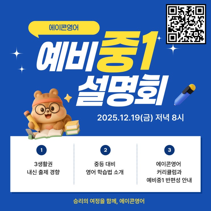 중학교에 입학하면 가장 크게 달라지는 과목 중 하나가 바로 영어입니다. 초등 영어가 ‘노출 중심’이라면, 중학교 영어는 문법·독해·서술형 평가까지 본격적인 성취도 평가로 이어지기 때문이에요. 그래서 많은 학부모님들이 “예비중1 영어, 지금 뭘 어떻게 준비해야 하나요?” 라고 가장 많이 물어보십니다. 세종 **에이콘영어(구. 버크앤리입시학원)**에서는 2025년 예비중1 학부모님들을 위해 중1 1학기 내신 대비 설명회를 준비했습니다. ⸻ 예비중1 영어 설명회 안내 • 일시: 12월 19일(금) 저녁 8시 • 장소: 에이콘영어 (세종 남세종로 466, 아평빌딩 704호) 이번 설명회에서는 다음 내용을 중점적으로 다룰 예정입니다. ⸻ ....... <img src="https://blogthumb.pstatic.net/MjAyNTEyMTJfMTUy/MDAxNzY1NTQzNDc1Mzgx.gRETVcpSltN86PI7L1bSEmNsubrojeVeb3BTcOFx568g.CsKmntKHG6m8bdRpz9bEuE4OIX-1v2Cpug11pbNIXrUg.JPEG/KakaoTalk_20251212_211740599.jpg?type=s3" />