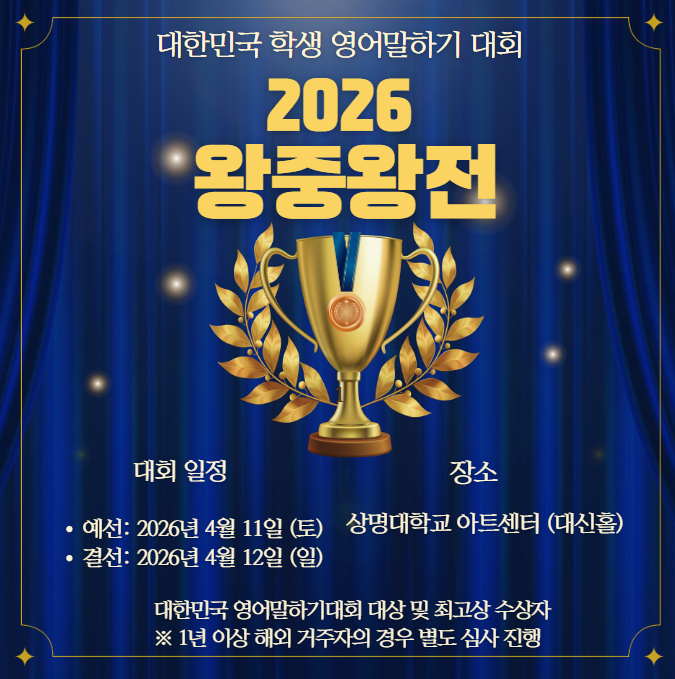 안녕하세요, 굿즈어학원 입니다. 세계예능교류협회에서 주관하는 영어말하기대회 ‘왕중왕전’이 2년마다 개최되는 전국 최고 수준의 무대로, 2026년 4월 예선과 결선이 진행될 예정입니다. 왕중왕전 대회는 한국에서 열리는 영어 말하기 대회의 정점이라고 볼 수 있는 무대입니다. 이 대회는 2024년과 2025년, 2년 동안 각종 영어 말하기 대회에서 대상과 최고상을 수상한 학생들만 참가하여, 진정한 실력자들끼리 다시 한 번 대결을 펼치는 최상위 레벨의 대회입니다. 굿즈어학원 역시 그동안 여러 명의 대상 및 최고상 수상자를 배출하며 왕중왕전 무대에 설 수 있는 실력 있는 학생들을 꾸준히 길러왔습니다. ■ 대회 일정 예선: 2026년 4월....... <img src="https://blogthumb.pstatic.net/MjAyNTEyMjBfMTYg/MDAxNzY2MjAwNTQyOTI0.91ZNUiHxhc0DJuRa2oU01sWxgW9znB4RH6ljGocd2o4g.GG6dIIK25uRSVOa9pMo6dEO7SYKGNATRtx6YYGdW1j8g.PNG/%BF%D5%C1%DF%BF%D5%C0%FC_2026.png?type=s3" />