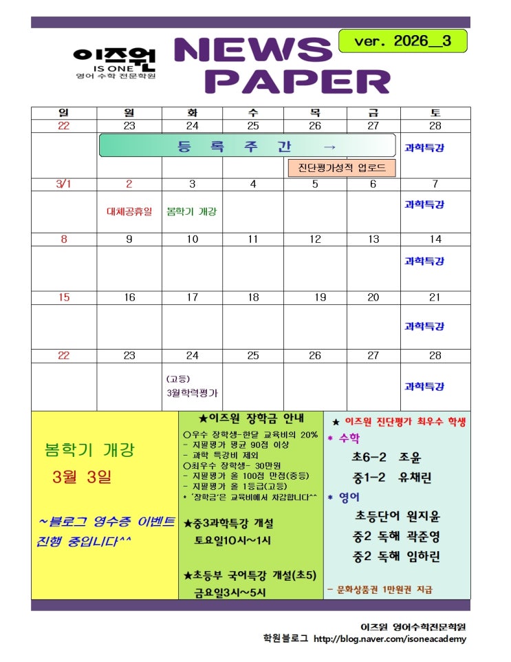 안녕하세요? 정상어학원 서수원분원 입니다. 26년 봄학기 수업 일정 및 차량안내 입니다. 차량 탑승 정류장 확인이 안 될 경우 학원으로 전화 부탁드립니다. 감사합니다.^^ 겨울학기 3/4(수)~5/28(목) 월수금 3/4(수) 개강 화목 3/5(목) 개강 <img src="https://blogthumb.pstatic.net/MjAyNjAyMjVfMjYx/MDAxNzcxOTkwMTI2OTMx.jdRhd97spVFeYlj-MrXsr3-QFNrWzjZ1M7oTCb9sMqcg.FsXyjnbZXHHINI7qVhaK_g0otLRYFAtS052gNKQuUY8g.JPEG/%C1%A6%B8%F1%C0%BB_%C0%D4%B7%C2%C7%D8%C1%D6%BC%BC%BF%E4._%2816%29.jpg?type=s3" />