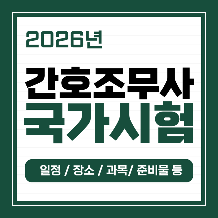 안녕하세요, 안양 간호조무사 범계간호학원입니다. 다들 남은 연말 잘 마무리하고 계신가요? 2026년 간호조무사 국가시험 일정이 발표났습니다! 아래 내용 참고하시어 시험에 대비바랍니다♥ 1. 시험일정 및 시험장소 2. 시험과목 및 시험시간 3. 합격기준 4. 준비물품 5. (시험 후) 준비 서류 1. 2026년 간호조무사 국가고시 <시험일정 및 장소> 전국에 시험장은 9곳입니다. 범계간호학원에서 가까운 범계역 기준으로 대중교통 이용할 때 가까운 시험장으로는 <서울 구로>와 <경기 성남>이 있는데요, 시험장 위치부터 주차장 이용, 시설 내부 안내는 아래 해당 사진 클릭하면 이동됩니다. 2. 2026년 간호조무사 국가고시 <....... <img src="https://blogthumb.pstatic.net/MjAyNTEyMTVfMjI3/MDAxNzY1NzY4MzA4OTcx.v-NodJXwNUVQLwOvqBJqu1bb4CDKELWqbRUTma42xZAg.LIckTJfcgl_ChaIAvOwv0Lk0erexFZklJLVFUHGLAmAg.PNG/%C1%A6%B8%F1%C0%BB_%C0%D4%B7%C2%C7%D8%C1%D6%BC%BC%BF%E4.png?type=s3" />