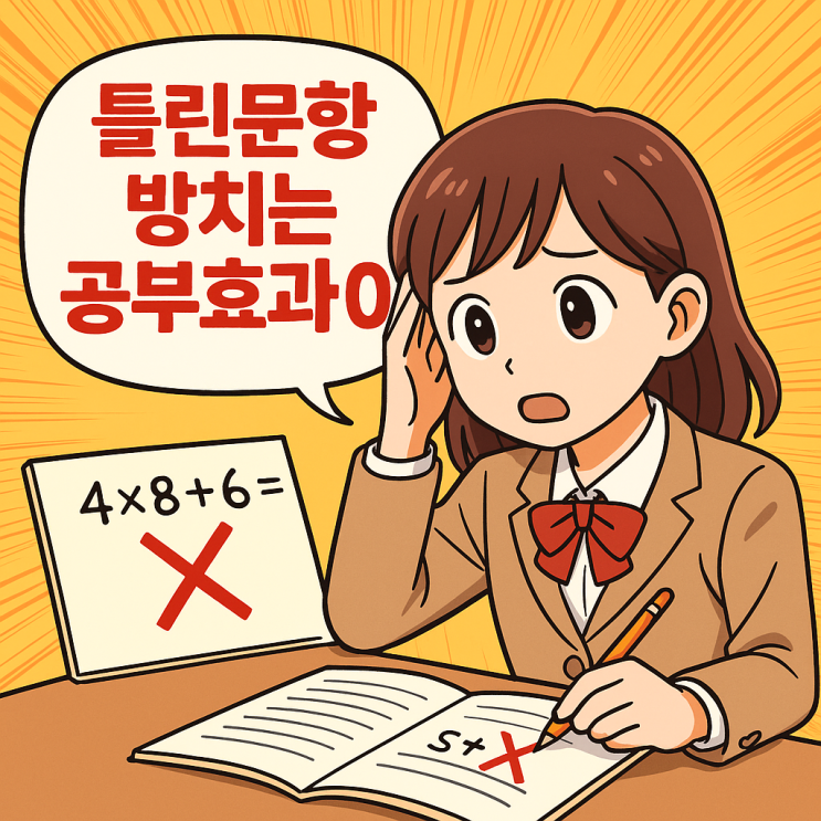 수학 성적이 쉽게 오르지 않는 가장 큰 이유 중 하나는 틀린 문제를 ‘그때만’ 보고 다시 보지 않기 때문입니다. 많은 학생들이 “이 문제는 실수였어”, “다음엔 안 틀릴 거야” 라고 생각하고 넘어가지만, 수학에서는 이 태도가 치명적입니다. (1) 수학 실력은 ‘맞힌 문제’가 아니라 틀린 문제에서 자란다 맞힌 문제는 이미 할 수 있는 것을 확인하는 과정이고, 틀린 문제는 아직 못하는 개념·사고 과정을 드러냅니다. 즉, 틀린 문제 = 나의 약점 오답을 분석한다 = 약점을 정면 돌파하는 것 수학은 누적 과목이기 때문에 하나의 약점이 다음 단원의 이해까지 계속 발목을 잡습니다. (2) 틀린 문제를 반복해야 같은 유형을 안 틀....... <img src="https://blogthumb.pstatic.net/MjAyNTEyMTBfMTcg/MDAxNzY1MzQwNTkwOTk2.qdNnA_53mlAMJgyM3j2HwdWGwvp6cx1cB1eetkTf4IQg.7G-37wHuOm2pEn3JT1tjnHwaWuiVmQIb5Bi90nYwG74g.PNG/%C6%B2%B8%B0%B9%AE%C1%A6%B9%E6%C4%A1%B4%C2_%B0%F8%BA%CE%C8%BF%B0%FA0.png?type=s3" />