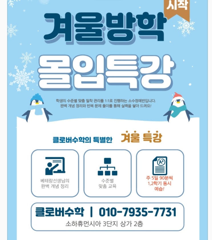 수학을 시작하는! 예비 초등4학년, 예비 중1 크리스마스 특별 선물 드려요 수학 첫달 50% Cut (12월 25일까지 등록시) “소수만의 집중, 하나하나의 성장.” “적은 인원, 깊은 밀착. 차원이 다른 이해.” “혼자 두지 않습니다. 끝까지 함께 합니다." “정말 중요한 건, 얼마나 가르치느냐가 아니라 어떻게 가르치느냐다.” 초등! 연산이 중요하니 연산만 시키고 있나요? 중학교 입학부터 후회가 시작되실 거에요. 심화서를 공부하지 않으면, 실력 향상은 기대 할 수 없습니다. 중등! 선생님의 풀이를 구경만 하고 있나요? 이해 할 때까지! 풀 수 있을 때까지! 선행을 선행답게 고등을 준비합니다. 수학, 특별한 관리 시작 합니다. <img src="https://blogthumb.pstatic.net/MjAyNTEyMTFfMTYg/MDAxNzY1NDM1NDE2MjY4.iafuzqJ3TS2ut44gUcgUXnGmjfBDO3kynzSxrF9EDcQg.FtgM7tZrN8sJMnXpb3Phxf3NSvfZlTbqwMdlcDM6VNYg.PNG/900%A3%DFfile%A3%DF00000000d72472079100b667cc3b8ca5.png?type=s3" />