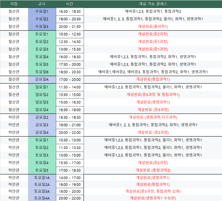 과학 전담 선생님들의 수업 시간 확대로 학생 일정에 맞춘 신규 과학 정규반 개설이 가능해졌습니다. 이에 따라 예비중 과정부터 통합과학, 고등 선택과목까지 과목별·시간대별 수업을 보다 유연하게 운영할 수 있게 되었습니다. 하이엔드 과학 수업은 이렇게 진행됩니다 하이엔드 과학 수업은 완자,오투 교재를 기반으로 단원별 핵심 개념을 정리하고, 하이탑, 개념픽, 수능특강, 하이엔드 자체컨텐츠를 통해서 중등–고등 과정의 흐름을 고려해 수업을 구성합니다. 문제 풀이 이전에 개념의 원리와 연결 관계를 충분히 이해한 뒤 적용과 문제 해결로 이어지도록 지도합니다. 현재 운영 중인 과학 수업 시간표 안내 (※ ‘개설완료’로 표시된 반....... <img src="https://blogthumb.pstatic.net/MjAyNTEyMjBfMTU1/MDAxNzY2MjE2MDE2MTY2.WifP51YiE-6QRSganet2ySJ-yedjxHTJugmFgvxLtacg.mNNOuQSDZCMQN9cbgodP0_slceT5dZc4kYkoRVhiFvcg.PNG/%B0%FA%C5%BD%C3%D6%C1%BE.png?type=s3" />