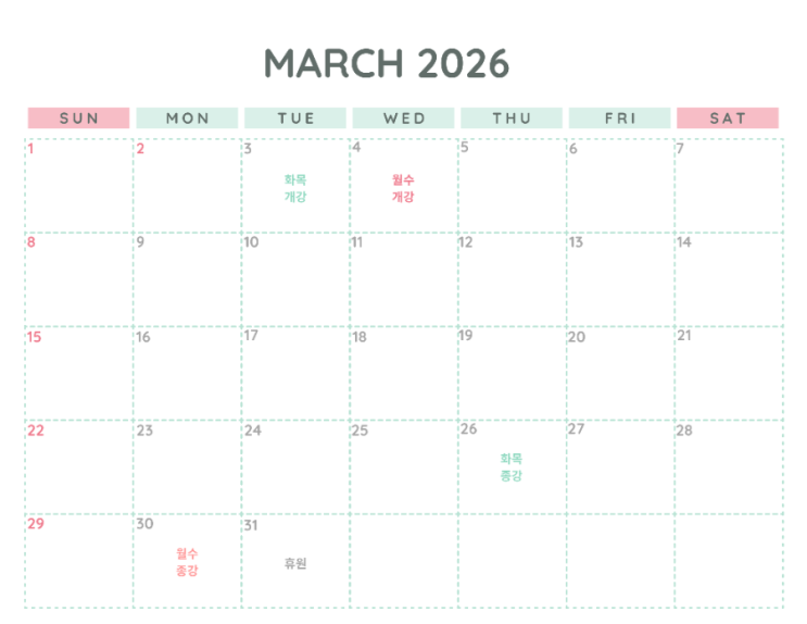 3월 수강시작은 3월 4일(월수금),3월3일(화목)입니다. 3월 종강일은 3월30일(월수금),3월26일(화목)입니다. 3월 휴원안내 3월31일은 휴원입니다. <img src="https://blogthumb.pstatic.net/MjAyNjAyMTlfMTg5/MDAxNzcxNDk0MjYxMjg4.TM9tBvUCztIOzBPxBhtyKeHGAbEbprO2yIzr8bpppHsg.IAeKRqAW9L0p0m1b_dcY9fQxRcn5K_gulOEYJI0IAT0g.PNG/900%A3%DF1771493988511.png?type=s3" />