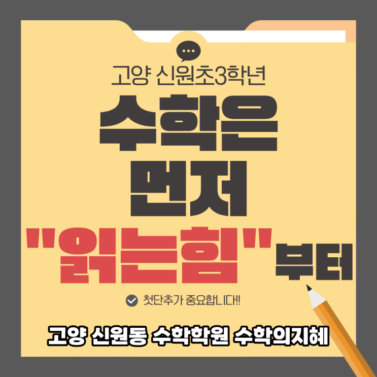 초등 3학년이 되면 본격적으로 분수가 시작됩니다. 많은 학부모님들이 “계산만 잘하면 되는 것 아닌가요?” 라고 생각하십니다. 하지만 분수는 계산 과목이 아닙니다. ‘의미’를 이해하는 단원입니다. ❗ 이런 친구는 점검해야 합니다. 1/2와 1/3 중 뭐가 큰지 설명을 못 한다 2/4와 1/2가 왜 같은지 말로 못 한다 그림 없이 계산만 하려고 한다 이 상태로 선행을 하면 중학교에서 비례, 방정식, 함수까지 전부 흔들립니다. 왜일까요? 분수는 “전체를 나누어 보는 사고”의 시작이기 때문입니다. 초3이 되면 분수가 시작됩니다. 분수의 본질은 계산이 아닙니다. ‘이해’와 ‘표현’의 시작점입니다. 특히 고양신원초등학교 3학년 과정은 단순....... <img src="https://blogthumb.pstatic.net/MjAyNjAyMjNfODQg/MDAxNzcxODIxMDAxODE1.3kR8-xrHi55gSTSGCwMsuo8yGKyzxKsTyrgM1wUGKFwg.bleOtjxSSIIDeK1pbZDmBjwkF4ewSZ-OfCpKhpjxK88g.PNG/1.png?type=s3" />