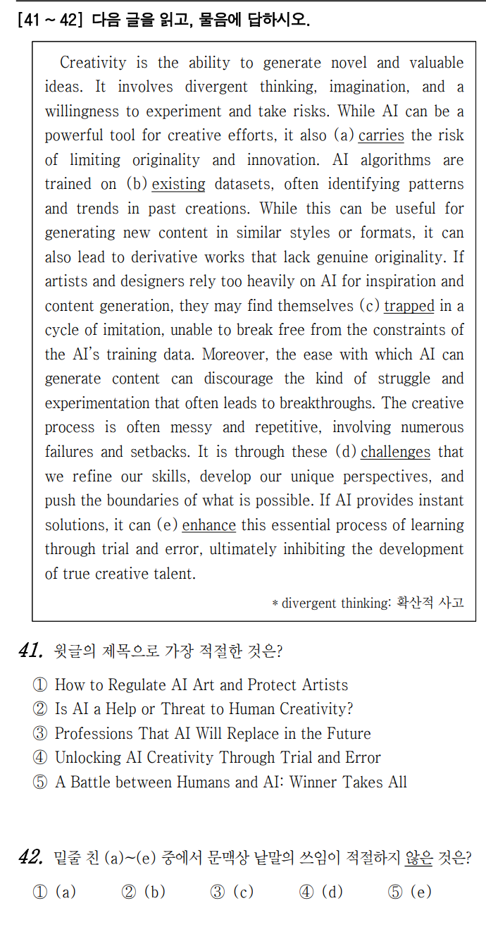 안녕하세요, 영수공감학원입니다! 25년 10월 고1 모고 41-42번 지문은 AI와 인간의 창의성이라는 아주 트렌디하면서도 본질적인 주제를 다루고 있습니다. 장문 독해는 호흡이 길어 학생들이 지치기 쉽지만, 제목+어휘 문제라서 논리 구조만 파악하면 맞히기 좋은 효자 문항이 될 수 있습니다. 이 지문은 AI가 인간의 창의성에 미치는 부정적 영향을 다루고 있습니다. 도입부) 창의성이란? 새롭고 가치 있는 아이디어 생성이다. 문제점 1) AI는 기존 데이터에 기반하므로 독창성이 부족하여 모방의 굴레에 빠진다. 문제점 2) AI의 편리함이 창의성의 기본인 고군분투와 실험과정을 단념시킨다. 결론) AI는 창의적 재능 발달을 방해한다. 1등급은 이....... <img src="https://blogthumb.pstatic.net/MjAyNjAyMjNfMjYx/MDAxNzcxODMzMTkwMDg0.s3ozHxQTkRGBHAAJTJIhBPgrkFyTRRS-xbM1VrX64-wg.BYMXlu4ljw1B8QcA4Wzpbl4HhlvJ_fv47n9jI7imVHkg.PNG/image.png?type=s3" />