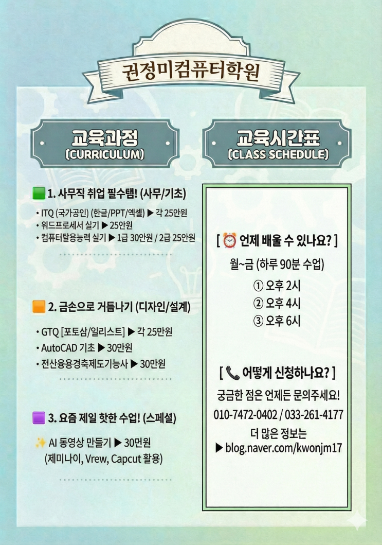 우리 동네 컴퓨터 전문가! 권정미컴퓨터학원 신규 수강생 모집 안내