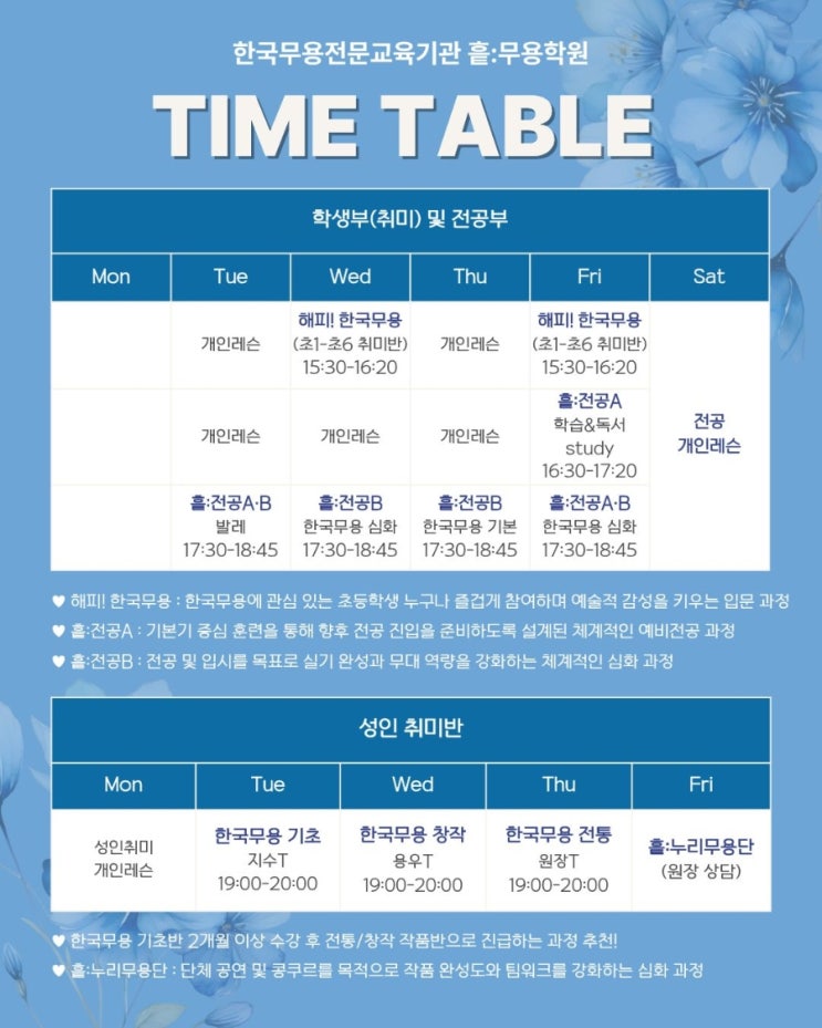안녕하세요 몸과 마음이 흩날리는 '흩:무용학원'입니다 [ 흩:무용학원 시간표 ] 공지드립니다! ☁️학생부(취미) 및 전공부☁️ ▪️해피! 한국무용 : 한국무용에 관심 있는 초등학생 누구나 즐겁게 참여하며 예술적 감성을 키우는 입문 과정입니다. ▪️흩:전공A (초등4학년-중등2학년/원장 상담) : 기본기 중심 훈련을 통해 향후 전공 진입을 준비하도록 설계된 체계적인 예비전공 과정입니다. ▪️흩:전공B (초등4학년-고등3학년/원장 상담) : 전공 및 입시를 목표로 실기 완성과 무대 역량을 강화하는 체계적인 심화 과정입니다. ☁️성인취미반☁️ ▪️한국무용 기초반 2개월 이상 수강 후 전통(목)/창작(수) 작품반으로 진....... <img src="https://blogthumb.pstatic.net/MjAyNjAyMjNfMjU1/MDAxNzcxNzc1NjY5OTMx.WGm7h7Bnz_SAkiyd0d6hSTmr6qFmC8Xmlm3nzkWzz-Eg.3hkFxDibrNg3DKM0jC4fgjqKaLhsuf8z8IBhsphxS_Ag.JPEG/900%A3%DF1771773668527.jpg?type=s3" />