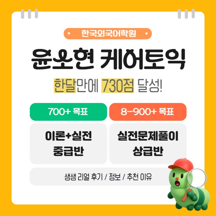 꼼꼼한 케어가 필요한 분들에게 추천합니다! 한달만에 730점! https://learnersbox.co.kr/article/%EC%83%9D%EC%83%9D%EB%A6%AC%EC%96%BC%ED%9B%84%EA%B8%B0/4/2629/ 토익 점수가 필요해져 학교와 가까운 학원을 알아보다가 한국외국어학원을 등록하게 되었습니다. 영문법을 거의 모르는 상태에서 시작했기 때문에 700+ 목표반 케어토익을 신청했고, 기초 문법부터 제대로 잡아보자는 마음으로 수강하게 되었습니다. 기본 영문법을 체계적으로 정리해 주셔서 문장 구조가 보이기 시작했고, 파트 1, 2 문제 풀이와 꿀팁을 통해 정말 수강하고 나서 정답률도 눈에 띄게 올라갔습니다. 특히 워크북에 있는 문법별, 파트별 문제 모음이 정말 도움이 많....... <img src="https://blogthumb.pstatic.net/MjAyNjAyMTlfMTYx/MDAxNzcxNDg1MDU2NTIy.Fsd9MrflbBjoEblagD1BRmTv4KJy9LPnnQ9wmcE6z-sg.MvJb6IL-P4juIzsptLgWbz4ERCvF8E2iCndpDwHeERog.JPEG/%C1%A6%B8%F1%C0%BB_%C0%D4%B7%C2%C7%CF%BC%BC%BF%E4_%282%29.jpg?type=s3" />
