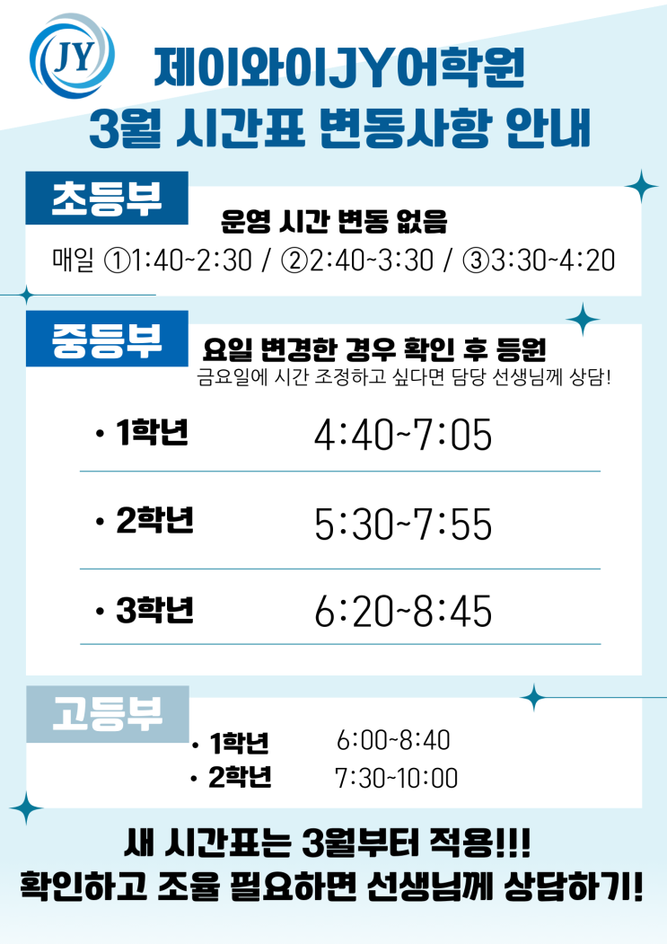 청주 개신동 영어학원 가경동 영어학원 제이와이JY어학원입니다~ 많이들 궁금해하시던 3월 시간표 안내 관련해서 공지드립니다(^^) 개신동 영어학원 가경동 영어학원 제이와이JY어학원에서는 2026년 3월부터도 초등부(휴식 없이 50분)는 기존과 동일한 운영시간을 유지하며, 중등부/고등부의 경우 3교시/2교시로 나누어 운영하는 만큼 학년별로 시작 시간이 다른 점 확인 부탁드립니다! 성인회화/1:1회화반의 경우 상기 스케쥴과 별도로 운영하므로(오전반/오후7시~) 성인부의 경우 학원으로 별도 문의 바랍니다. #청주영어 #청주어학원 #개신동학원 #개신동어학원 #개신동영어학원 #학년대비 #진급준비 #내신전문 #초등부 #중등부 #고등부 #고등....... <img src="https://blogthumb.pstatic.net/MjAyNjAyMjRfMTYx/MDAxNzcxOTIwODY1MDI4.Yko2FyJTHwjfmE8GpQXB66Ofw7lP4EnVMQbdoIK8Tfwg.ijsR9VZuY4Aw9oPdJdoVsR4CTsH0pJg1urgEUbyWz0Qg.PNG/%C3%CA%B5%EE%BA%CE.png?type=s3" />