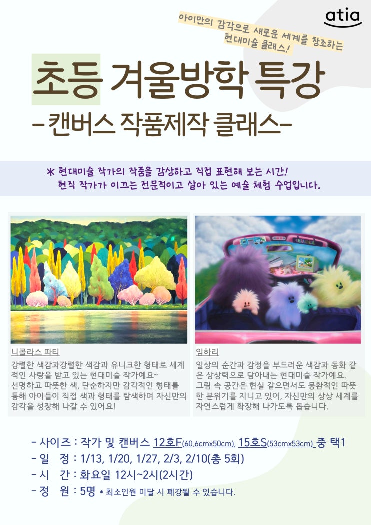 안녕하세요. 강동구 명일동 미술학원~ 아티아미술센터입니다. 아티아미술센터에서는 이번 겨울방학을 맞아 아이들의 표현력과 예술적 감각을 한 단계 성장시킬 수 있도록~ 작품제작 클래스, 소묘 특강, 수채화 특강 세 가지 특별 프로그램을 준비했습니다. '현대미술 작품제작 클래스' 먼저 소개해 드립니다. 이번 작품제작 클래스는 현대미술 작가의 작품을 감상하고, 이해하고, 나만의 시선으로 재해석해 표현하는 과정을 경험하는 수업입니다. 현직 작가 선생님과 함께~ 색감, 형태, 화면 구성에 대해 깊이 있게 탐구하며 자연스럽게~ 창의력과 예술적 감각이 확장할 수 있는 클래스입니다. ★ 수업 안내 〉 사이즈 : 캔버스 12호 F....... <img src="https://blogthumb.pstatic.net/MjAyNTEyMTNfMTQ4/MDAxNzY1NjExMjYzODg4.WzPn_idMZFYB9qCkJvhOm9WoMyy1XddVdZiwg8m_QN0g.Pw2ezsQcvbWE9MAHNRo2jbdZkwtxJjkJp0T7xjTxkGAg.JPEG/%C1%A6%B8%F1%C0%BB_%C0%D4%B7%C2%C7%D8%C1%D6%BC%BC%BF%E4.jpg?type=s3" />