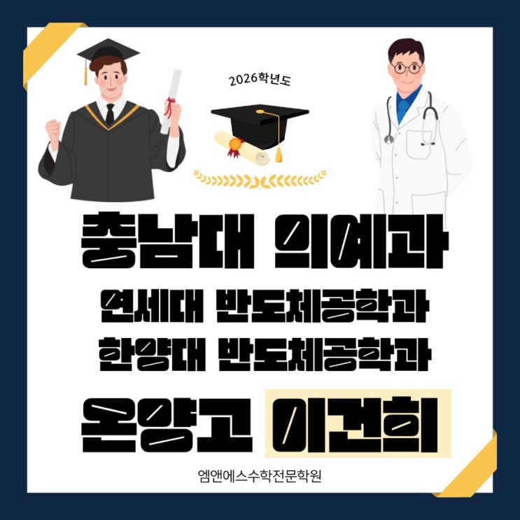 이번 수능에서 수학(미적분) 1등급이라는 뛰어난 성과를 거두며 좋은 결과를 만들어낸 이건희 학생의 합격 소식을 전합니다. 이번 해 의예과 두 번째 합격 소식이기도 합니다. ✨합격 대학✨ * 충남대학교 의예과 * 연세대학교 시스템반도체공학과 * 한양대학교 반도체공학과 이건희 학생은 고등학교 1학년때, 혼자 수학 공부를 이어가던 중 원하는 만큼의 성과가 나오지 않아 저희 학원에 등록하게 되었고, 이후 내신과 수능 모두에서 꾸준히 수학 1등급을 유지해 왔습니다. 결국 이번 수능에서도 수학 1등급으로 완벽하게 마무리하며 자신의 실력을 증명해 보였습니다. 시키는 학습을 성실하게 따라왔고, 단 한 번도 결석 없이 수업에....... <img src="https://blogthumb.pstatic.net/MjAyNTEyMTlfMjM4/MDAxNzY2MTQyOTY3NDYw.oSmx3WIk6CP_YrQCxDN21OrHiEq3K1IGrt-RUbkiw48g.G5uXPuV4UMWWzku0Hmv1Vbio9ILzp0FQCd8sQfAj46og.JPEG/IMG%A3%DF8130.jpg?type=s3" />