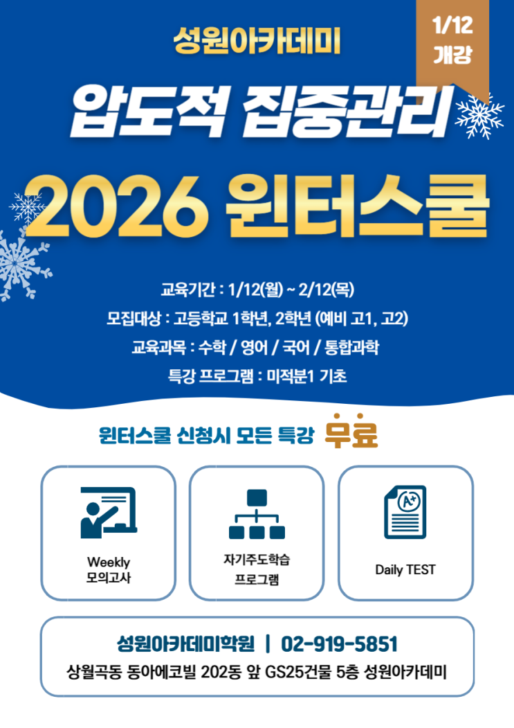 안녕하세요 성북구 월곡동에 위치한 성원아카데미학원입니다. 겨울방학이 얼마남지 않았습니다. 대학은 중3 겨울방학때 정해진다는 말이 있습니다. 따라서 예비고1의 겨울방학은 특별해야만 합니다. 성원아카데미학원에서 윈터스쿨 프로그램을 개설하였습니다. 겨울방학 이후 고등학교 입학 전까지 대략 2개월, 본격적으로 고등학교 준비 및 대학입시를 준비해야할 시기입니다. 고등학교 진학 전, 상위권으로 도약하기 위한 공부습관과 방법을 학습해야 합니다. 중학교에서 고등학교로 넘어가는 과정은 어렵고 힘겹습니다. 따라서 고등학교 과정을 미리 공부하고 변화된 교육과정에 적응해야합니다. 하위권 학생들에게는 이 시기가 역전의 발판, ....... <img src="https://blogthumb.pstatic.net/MjAyNTEyMjhfMjc2/MDAxNzY2ODk5ODQ0NDgx.3ma0Ox14_qrnORvUiGxlmIeEEvjNgFiUFYr2hkFs8Cog.hyAg-mciNuRHMxtqz4l4ZK99eZNpxWoPkrKqH3-VrG4g.PNG/KakaoTalk_20251227_160621058.png?type=s3" />